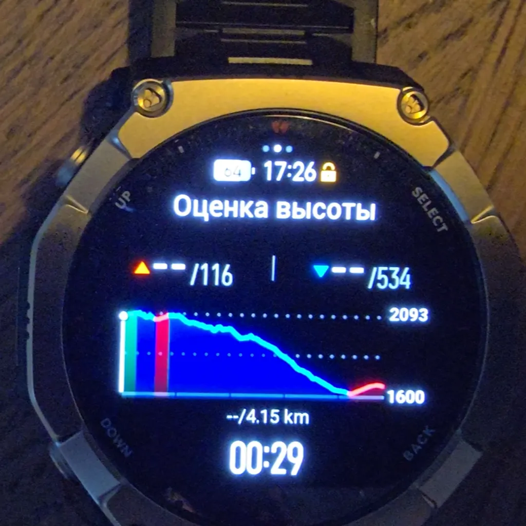 Представьте поход на две-три недели. Задача — максимально сэкономить энергию. Отключаем все мониторинги, переводим навигацию в режим экономии (для пешки точности хватает), сами часы — в умеренный энергосберегающий режим: без подъёма запястья, с пониженной яркостью. Карты, навигация, запись трека и возврат по треку остаются.