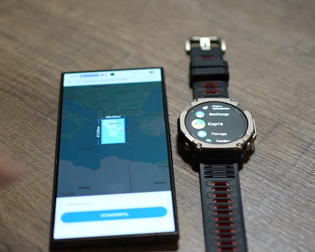 Нюанс в том, что карты действительно хранятся в памяти устройства. Но чтобы их распаковать, всё равно нужно заходить в приложение Zepp на телефоне и выбирать регион похода — точно так же, как раньше на T-Rex 3 и T-Rex 3 Pro. Полная карта занимает 28 ГБ — половину объёма хранилища — и всё равно требует выбора сегмента. Правда, процесс идёт быстро и надёжно. Решение спорное, но работает.