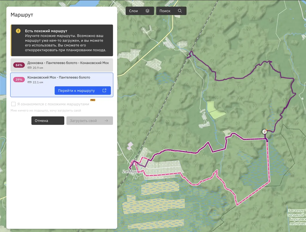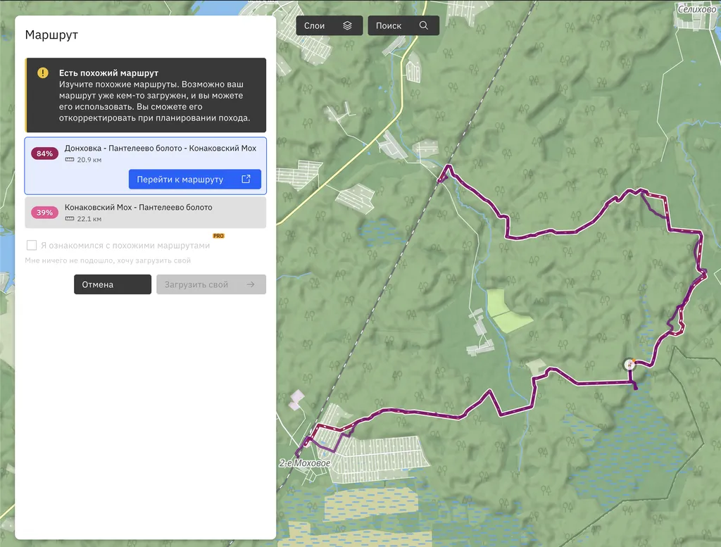 Если в найденных маршрутах имеются варианты, похожие на 70%+, то загрузить свой маршрут получится только обладателю подписки PRO. 70% - это очень высокая похожесть, незначительные расхождения, которые можно откорректировать руками в планировщике похода.