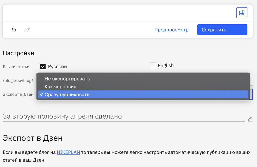 Пишите статью, выбирайте хотите ли вы экспортировать ее в Дзен. Можно экспортировать в виде черновика, чтоб потом подправить в самом Дзене.