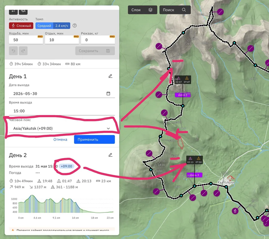 Все временные отметки на линии пути, все восходы и закаты - всё теперь зависит от выбранного часового пояса.