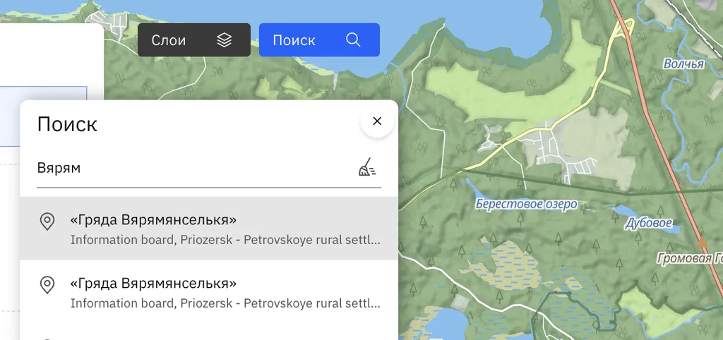 В поле поиска можно вбить как название, так и координату. Клик на найденное отмотает карту к этому месту.